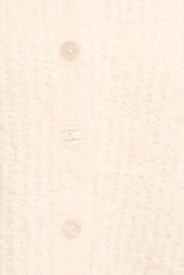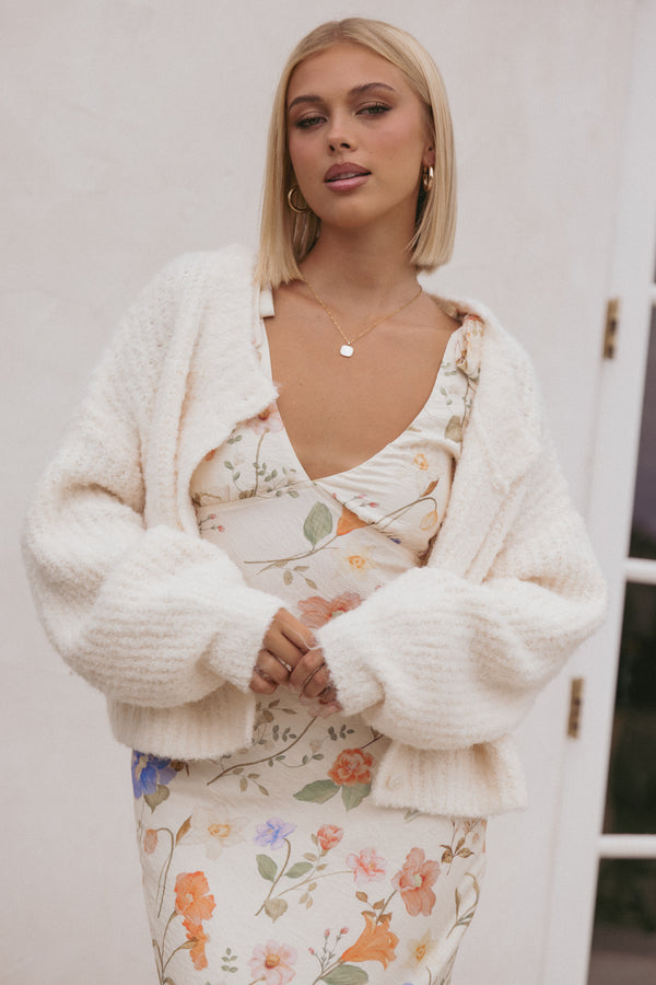 Slide into effortless style with the Albertine Cardigan in White. This chic crop-length cardigan is your perfect go-to piece for layering, blending seamlessly into your wardrobe with its classic round neckline and long sleeves finished with ribbed cuffs.
