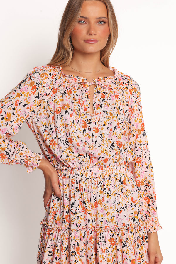 This mini dress is perfect for any special occasion. The mini length and flattering ruffle neckline with tie detail make this mini dress a feminine and fun choice. It also has long sleeves with shirred cuffs, a shirred waistband, and a tiered ruffle hem that adds to its charm.