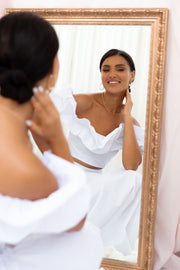 The off-the-shoulder style top is making a comeback and we’re loving it! This cropped length top features an eye-catching ruffle neckline, short sleeves and side invisible zips for easy dressing. Make a statement with this stylish piece that will take your wardrobe to the next level of cool.